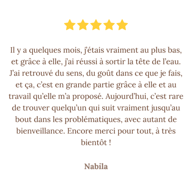 Ce qui me différencie, c'est cette capacité à écouter avec finesse et sans jugement, à créer un espace où l'on peut se déposer en sécurité, mais aussi à structurer des accompagnements concrets et sur-mesure, à la croisée de l'intuition, des outils thérapeutiques et de l'intelligence émotionnelle.